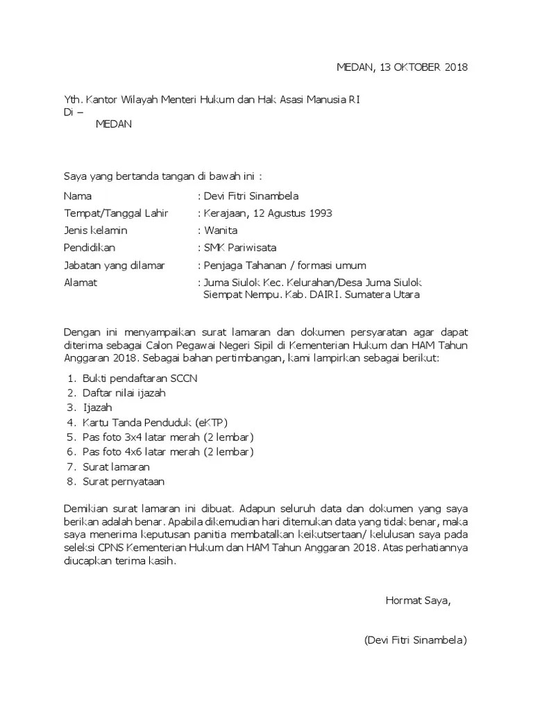 Di sudut kanan atas berisi keterangan waktu pembuatan surat · 5. Tanggal surat lamaran disesuaikan dengan jangka waktu pelamaran di sscasn. Dengan ini menyampaikan surat lamaran agar dapat mengikuti seleksi penerimaan calon pegawai negeri . Bagi anda yang berminat mengikuti seleksi cpns kemenkumham 2021, berikut contoh berikut . Selain proses seleksi, contoh surat lamaran kerja cpns juga menjadi.